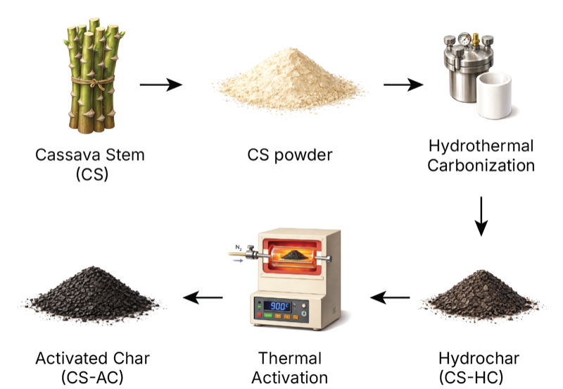 The conversion of cassava stem waste into activated carbon through hydrothermal carbonization followed by thermal activation presents a sustainable approach that addresses both waste management and water treatment challenges. Hydrothermal carbonization (HTC) is a thermochemical process that converts biomass into hydrochar under moderate temperatures (180–250 °C) and autogenous pressure, offering advantages such as low energy requirements, ability to process wet biomass without pre-drying, and production of materials with favorable surface properties [7,6]. Subsequent thermal activation can further enhance the textural properties and surface chemistry of the hydrochar, resulting in activated carbon with superior adsorption performance [1,5].