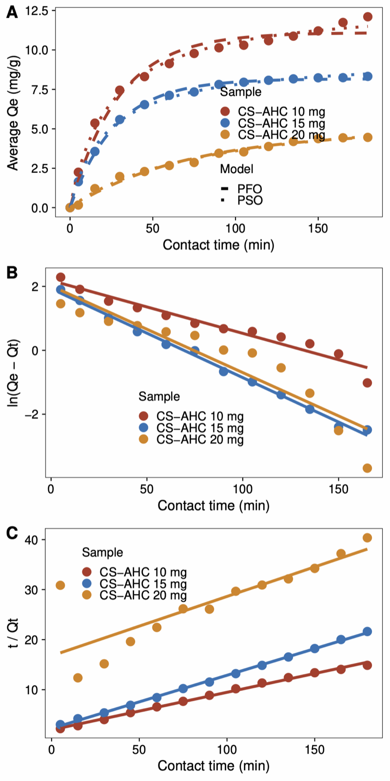 Figure 6. Kinetic plots for CS-AHC: (A) experimental data with non-linear PFO/PSO fits, (B) linearized PFO model, and (C) linearized PSO model.