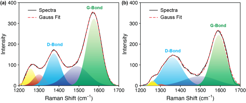 Raman spectroscopy was employed to investigate the carbon structure and degree of graphitization of the prepared materials, and the spectra of CS-HC and CS-AHC are shown in Figure 4. Both spectra exhibit the characteristic D-band (disorder) around 1350 cm−1 and G-band (graphitic) around 1580 cm−1. The D-band is associated with defects, disordered carbon, and sp3-hybridized domains, whereas the G-band corresponds to the in-plane vibration of sp2-hybridized carbon in graphitic domains [23]. In panel (a) (CS-HC), the G-band is more dominant relative to the D-band, indicating a higher fraction of ordered sp2 domains. In panel (b) (CS-AHC), the D-band becomes comparatively stronger and broader, suggesting a higher defect density and a more disordered/turbostratic structure after activation [24]. Accordingly, the ID/IG ratio provides a concise indicator of structural order: a lower ratio implies higher graphitization and structural order, while a higher ratio reflects a more defective or amorphous carbon network.