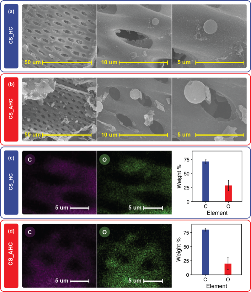Figure 5. SEM images and EDS elemental analysis of cassava stem hydrochar (CS-HC) and activated hydrochar (CS-AHC).