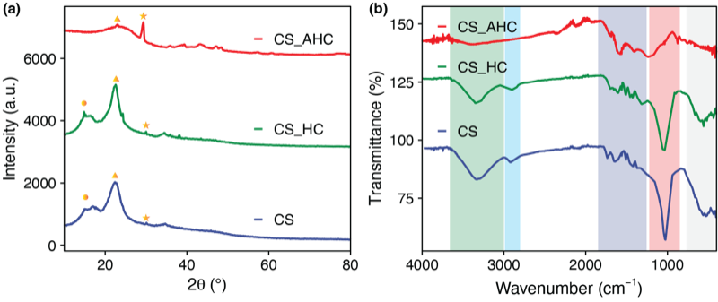 X-ray diffraction analysis was performed to investigate the crystalline structure and phase composition of the prepared materials. The XRD patterns of CS, CS-HC, and CS-AHC are presented in Figure 3a. The diffraction patterns provide insights into the degree of crystallinity, presence of mineral phases, and structural transformations that occur during the hydrothermal carbonization and activation processes.
