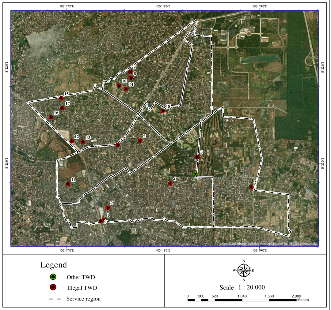 The solution for handling illegal TWD is designed based on the existing conditions of the distance between illegal TWD and legal TWD service areas using buffer analysis and in accordance with applicable technical provisions for waste management. Two complementary solutions are proposed: (a) illegal TWD within the legal TWD service area can be transferred to legal TWD using motorized carts; and (b) illegal TWD located outside the legal TWD service area are analyzed to identify recommended new TWD locations around the illegal TWD sites, so that the new TWD can serve as a solution for handling illegal TWD in those areas.