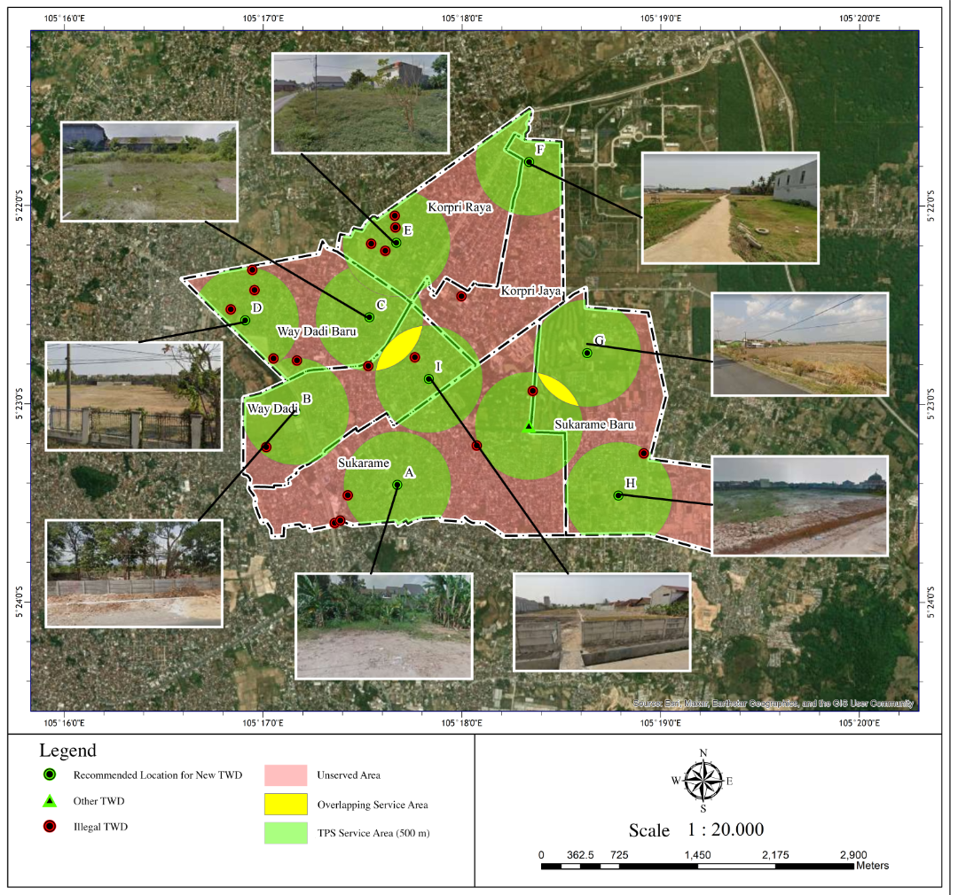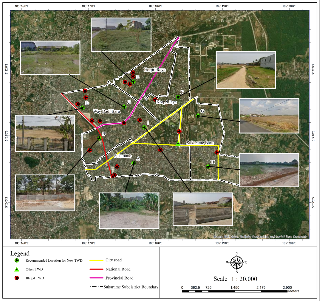 The identification of TWD sites involved a comprehensive field survey covering all villages within Sukarame Sub-district. Each identified site was classified as either legal or illegal based on the criteria previously described. Legal TWD sites were those officially designated and served by municipal waste collection services. Illegal TWD sites were unauthorized waste disposal locations that met the three criteria: volume > 1 m3, not served by government waste transportation, and operational for more than one month.